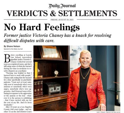 Before enrolling at Loyola Law School, now-retired appellate justice Victoria G. Chaney worked for several years as a registered nurse, and she's still using some of what she learned during her time in medicine to resolve disputes as a mediator.